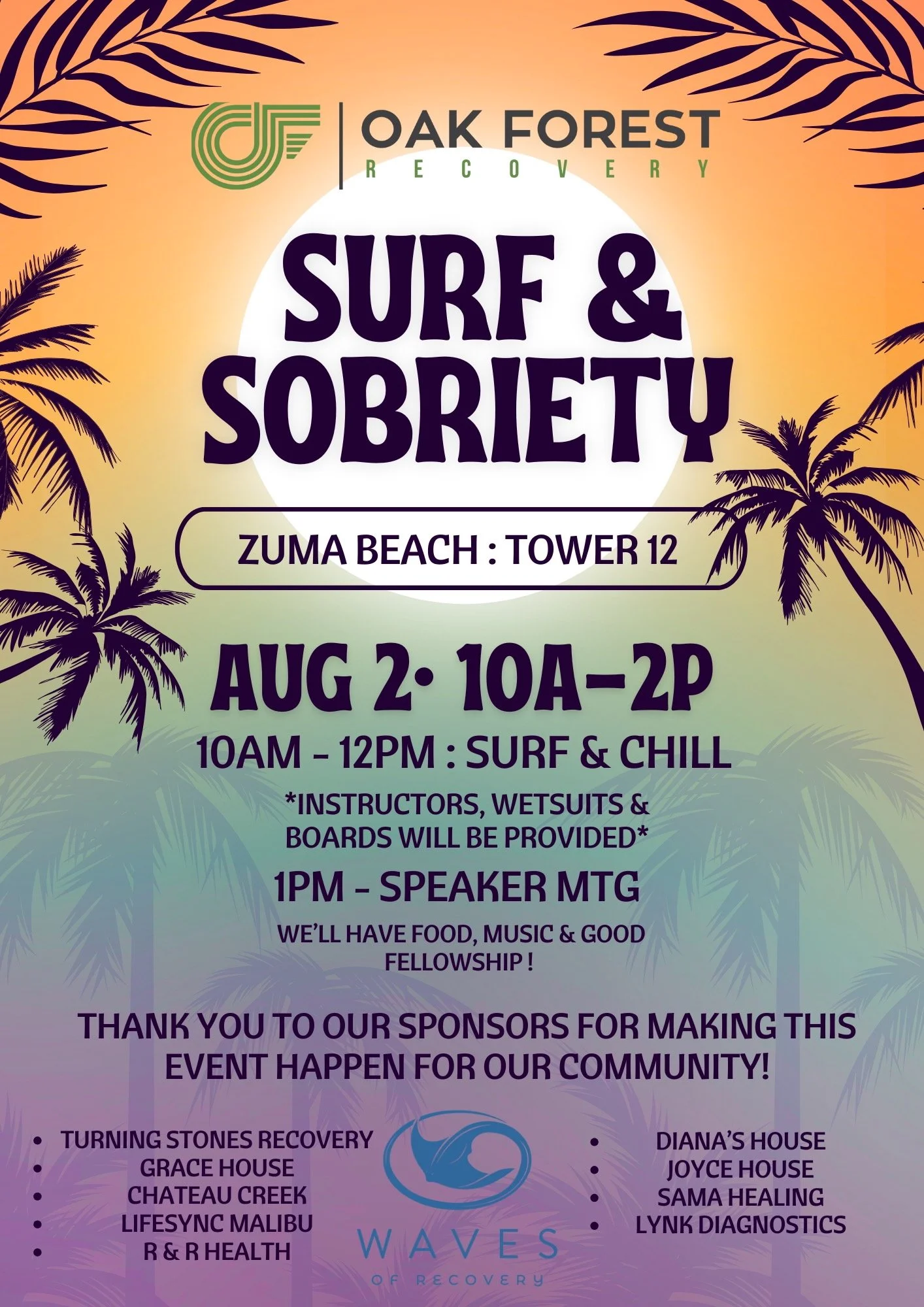 Back to All Events Surf & Sobriety Saturday, August 2, 2025 10:00 AM 2:00 PM Tower 12, Zuma Beach Malibu, CA, 90265 United States (map) Google Calendar ICS